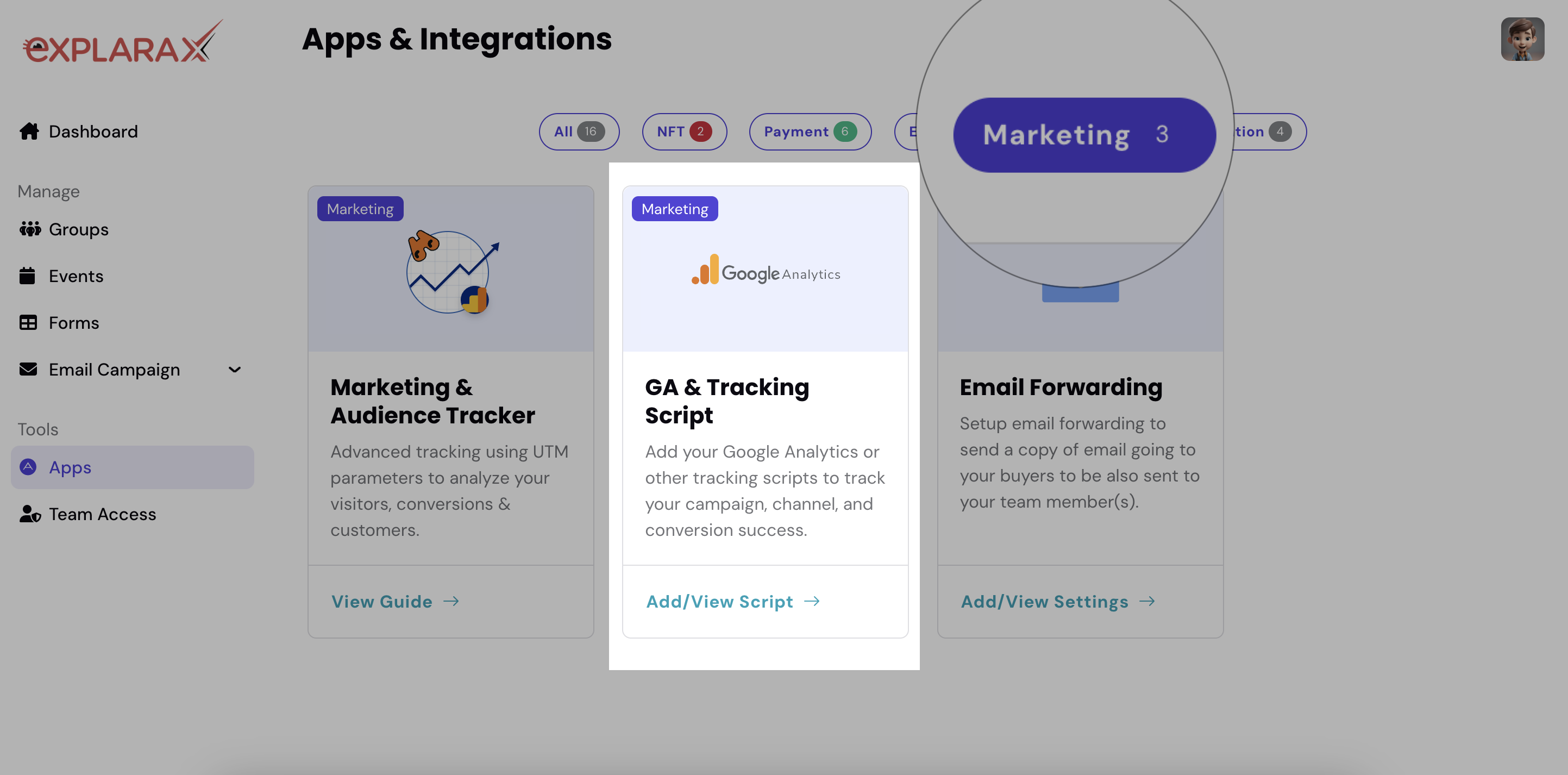 - Locate the card “GA & Tracking Script” and click on it.