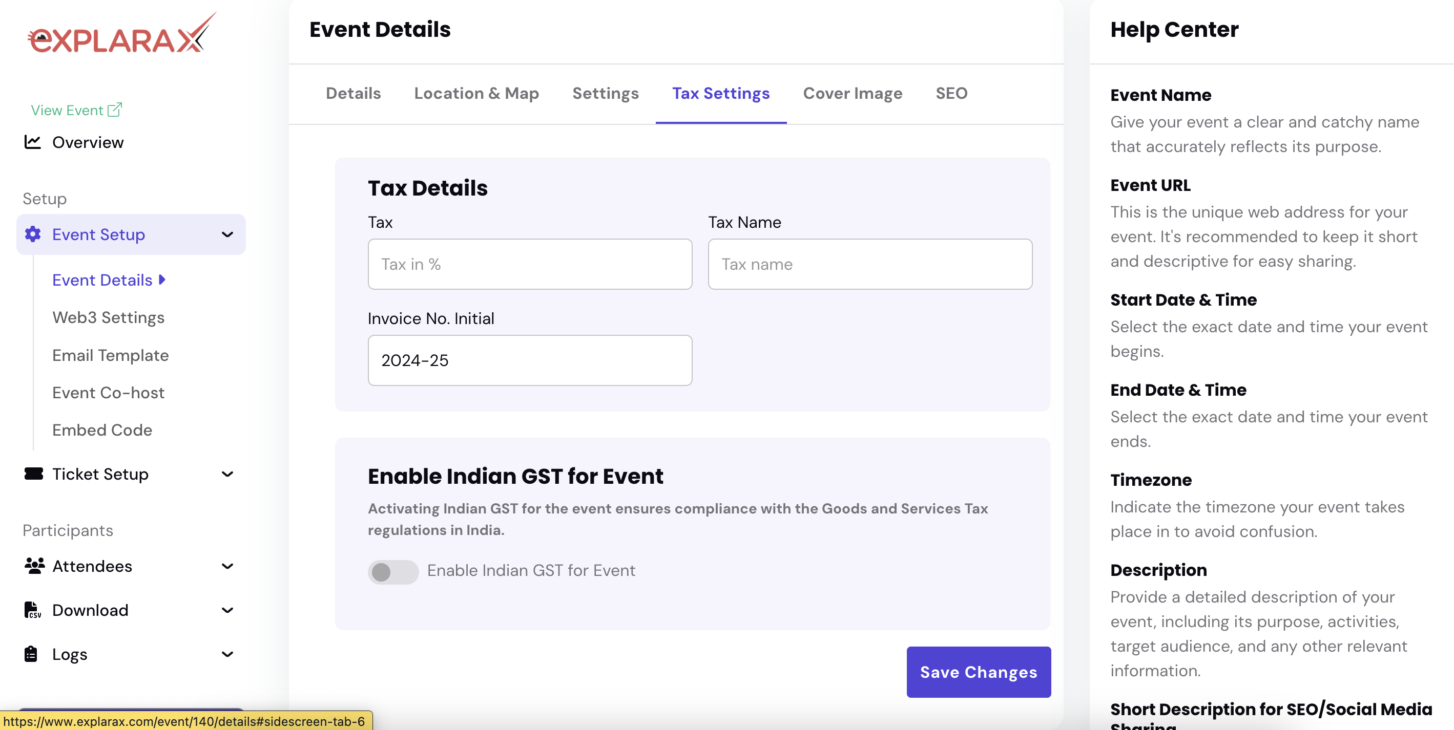 - If you are issuing GST invoices in India, enable the Indian GST for Event toggle. This ensures compliance with the Goods and Services Tax (GST) regulations in India.